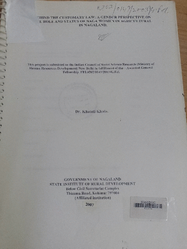 Behind the Customary law : a gender perspective on the role and status of Naga women in Agricultural in Nagaland / Khatoli Khala