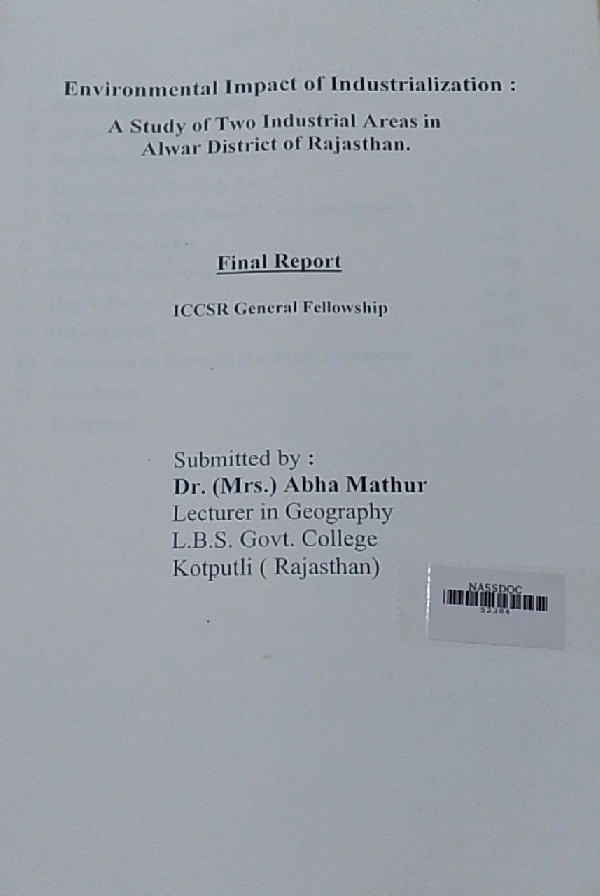 Environmental impact of industrialization : a study of two industrial area in Alwar district of Rajasthan / Abha Mathur